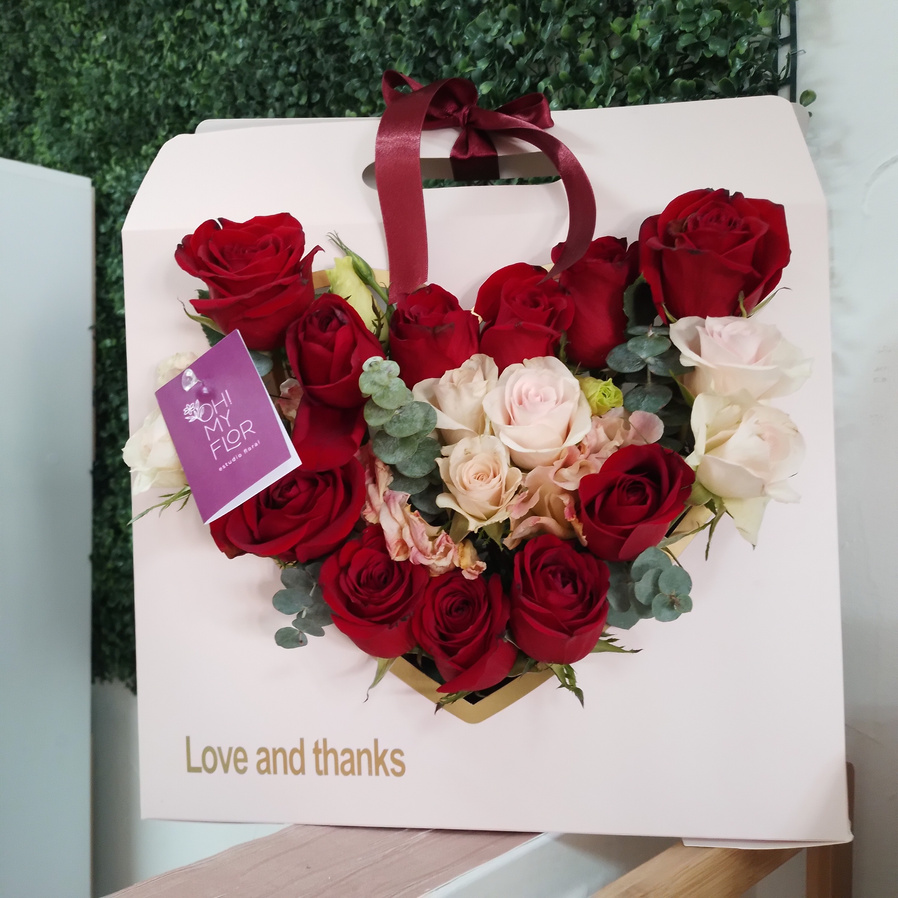 Caja vertical con corazón grande de rosas, lisianthus y otros follajes finos ¡me encanta!